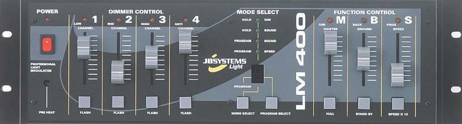 JBSystems LM400 Lichtsturing Aansturing van de 4 PAR 60 spots met ingebouwde programmas, getriggered door de muziek. |