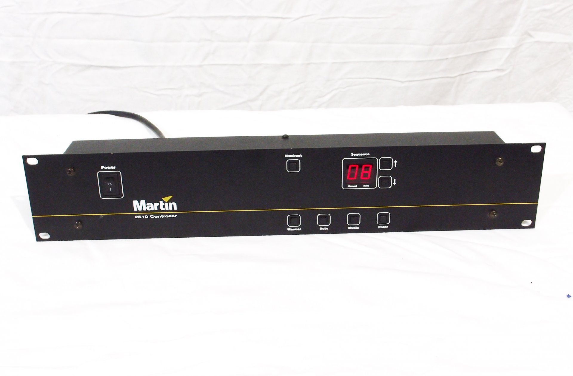 Martin 2510 DMX controller DMX Sturing voor oa de MX-4 scans, via voorgeprogrammeerde sequences. De sequences kunnen manueel worden bediend, via een automatische instelbare klok, of getriggered door de muziek. |