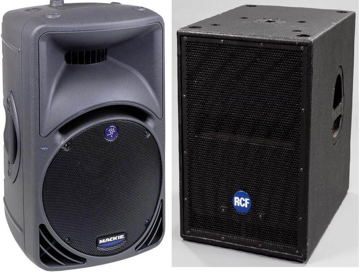 Voor de weergave van het geluid is gekozen voor professionele actieve luidsprekers die als referentie gelden in DJ en live toepassingen. De Mackie SRM450 is een robuuste en duurzame all-round luidspreker. De 12 inch woofer en 1.4 inch compressiedriver produceren respectievelijk 400 en 100 Watt RMS, met een gezamenlijke piek van 1000 Watt. Voor de subwoofers is gekozen voor de RCF 705 actieve speaker, uitgevoerd met een 15inch subwoofer, goed voor een vermogen van 800W in het laag per stuk. Het gezamelijk vermogen van deze combinatie levert 2500W totaal muziekvermogen. Voor de grotere feesten kan een dubbele set top speakers opgesteld worden om zo een nog groter vermogen te realizeren. |